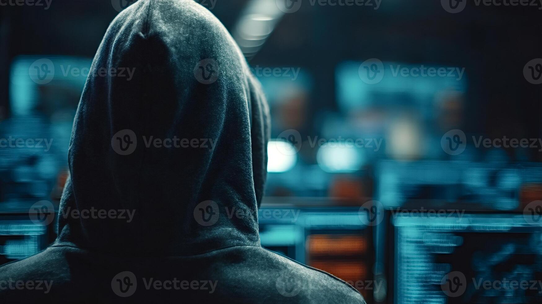 hacker en capucha trabajando en múltiple computadora pantallas Foto Pro