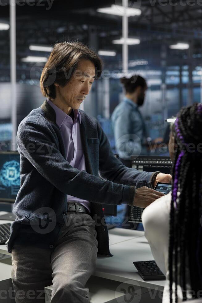 gerente y interno en datos centrar solucionar problemas servidor conectividad cuestiones utilizando ai. mayor programador y joven colega en servidor habitación auditoría sistemas para vulnerabilidades utilizando artificial inteligencia Foto Pro
