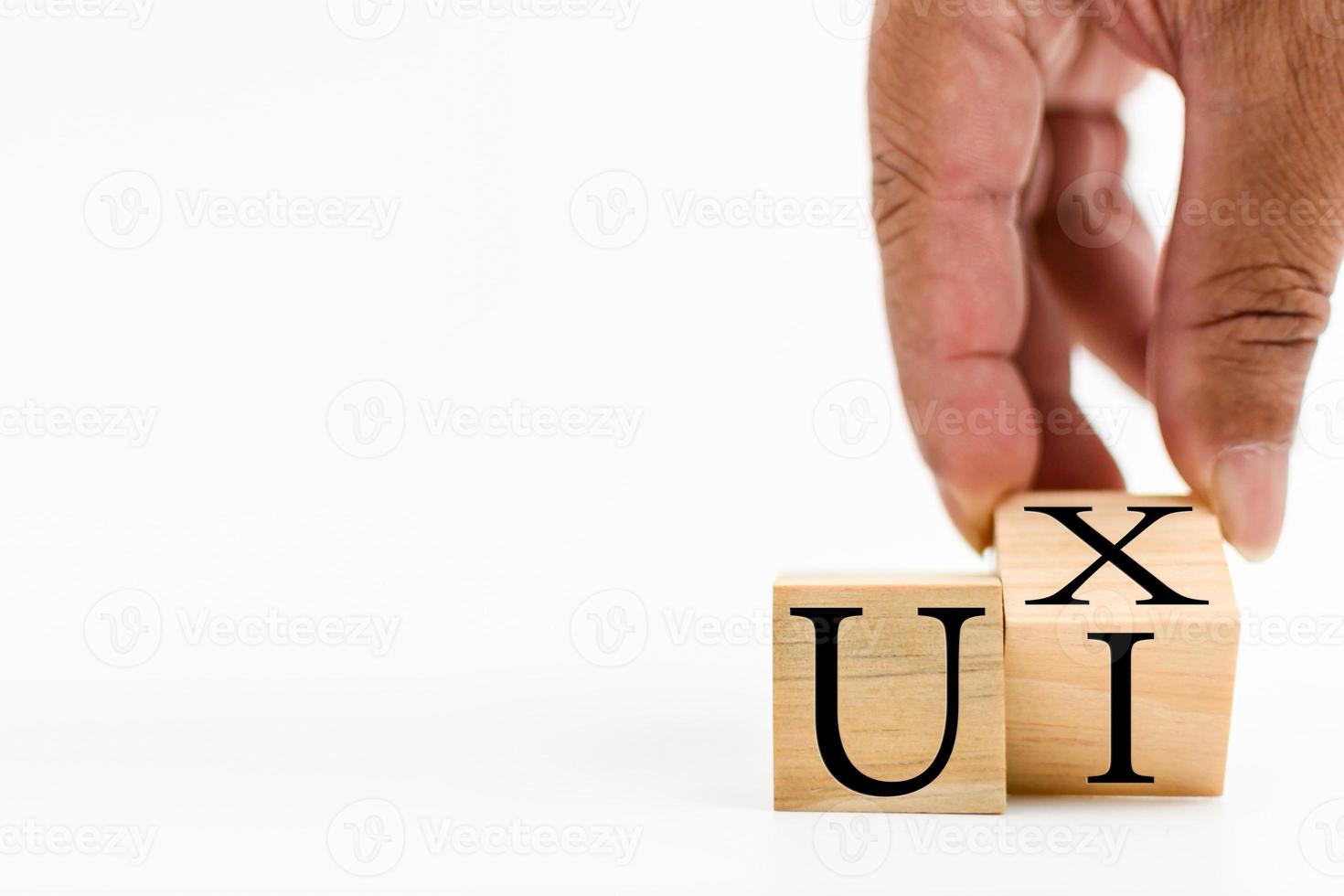 un cubo de madera sobre una mesa blanca con texto ui, ux. concepto de desarrollo y diseño y desarrollo, interfaz de usuario, experiencia de usuario, software, aplicación. copie el espacio a la izquierda para un diseño, fondo blanco. Foto Pro