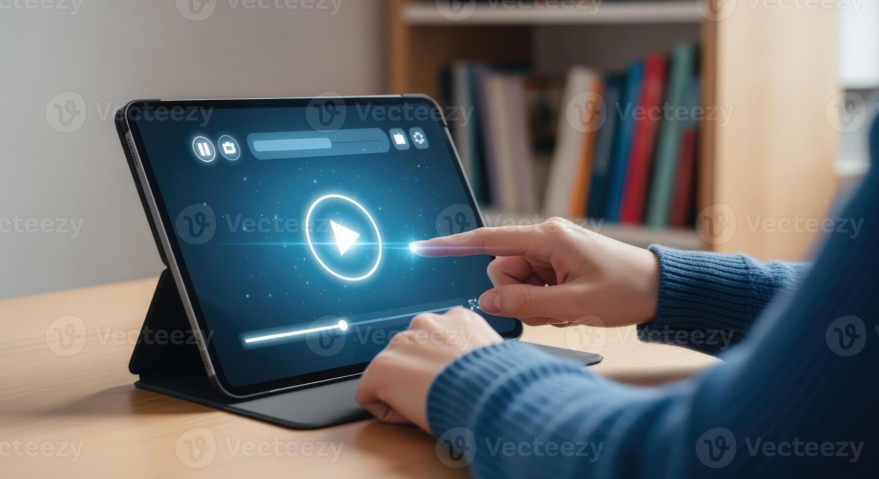 digital medios de comunicación transmisión persona utilizando tableta a reloj en línea contenido con jugar botón en pantalla Foto Pro