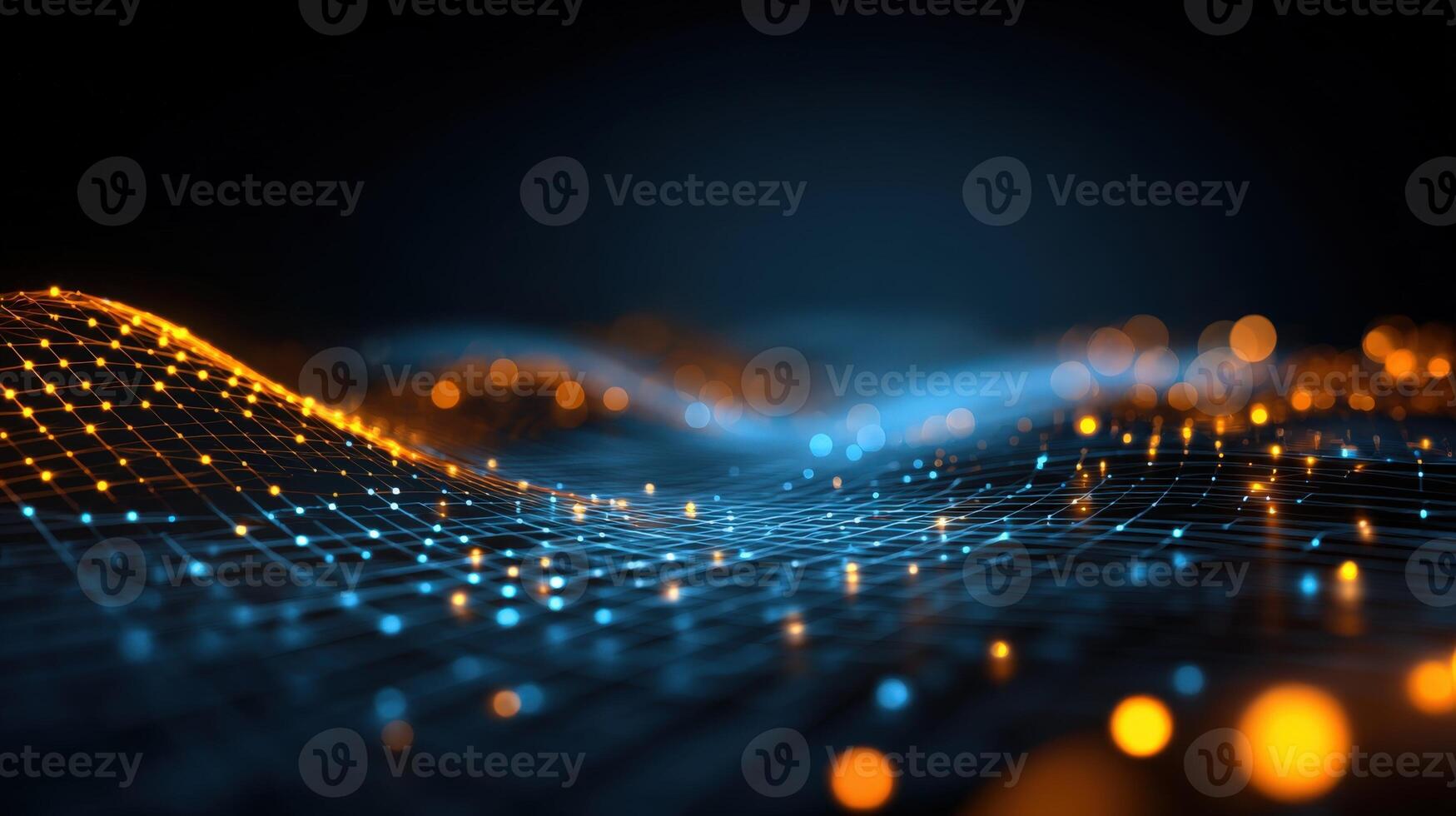 resumen datos red interconectado nodos formando ola modelo en azul y oro matices, representando conectividad Foto Pro
