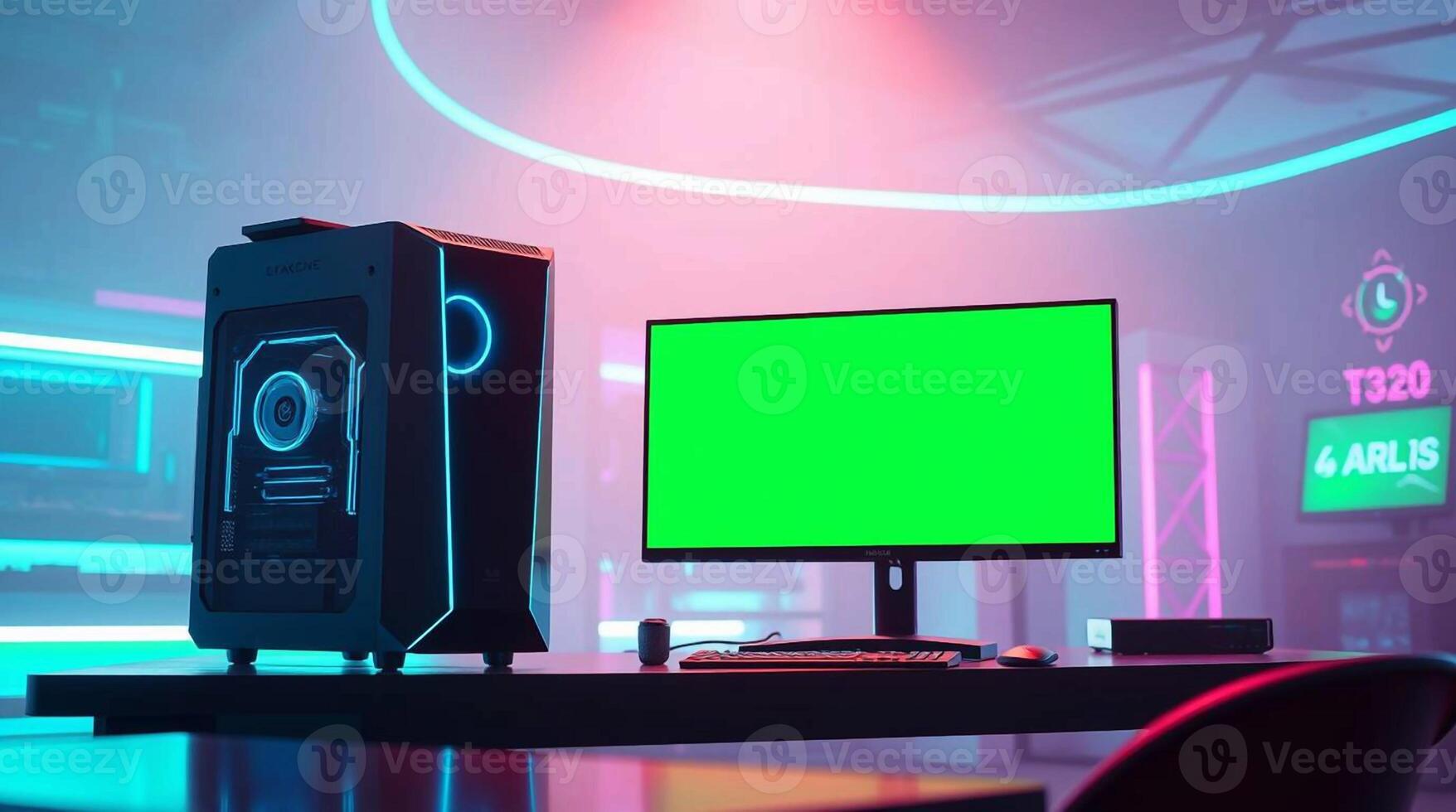 un computadora monitor y un verde pantalla en frente de un computadora Foto Pro