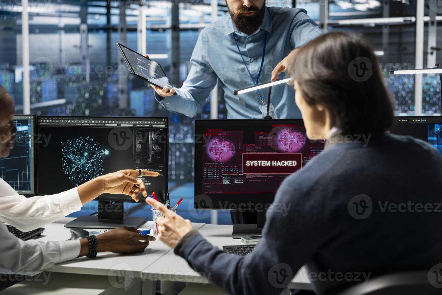 gerente y servidor cubo técnicos utilizar ai llm asistente a detener hacker robar sensible empresa datos. datos centrar supervisor y empleados quitando computadora virus incumplimiento seguridad sistemas Foto Pro