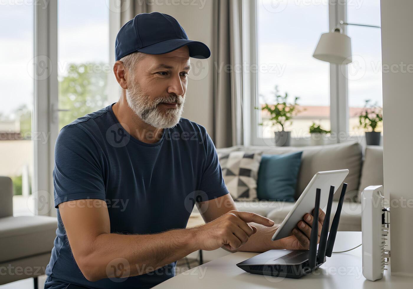 un hombre en un gorra es utilizando un tableta computadora Foto Pro