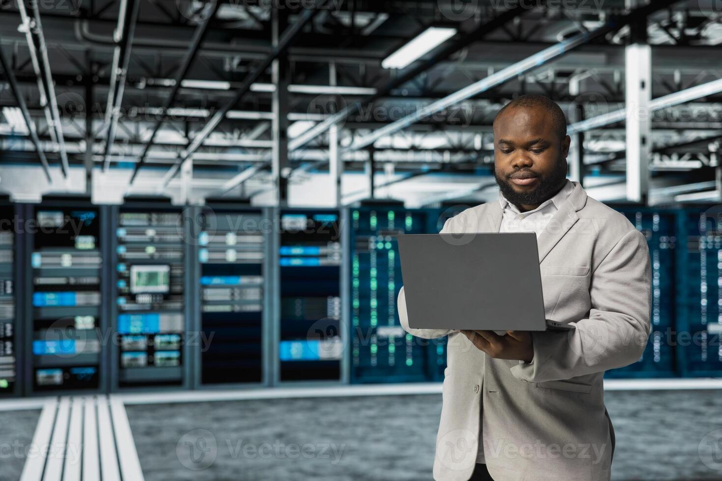 datos centrar software desarrollador corriendo error comprobación utilidades en computadora portátil, automatizando anomalía detección. servidor cubo eso profesional supervisión hardware actuación, mirando para red cuestiones Foto Pro