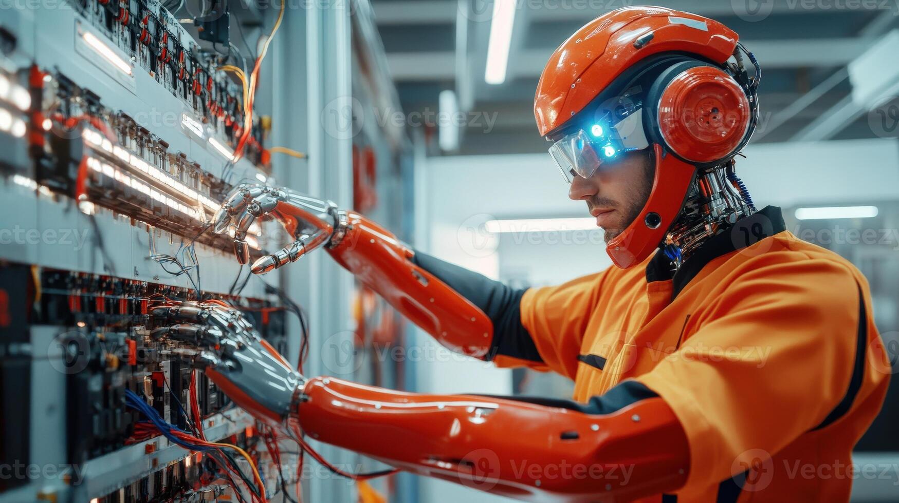 un robot en un naranja camisa y casco trabajando en un computadora Foto Pro