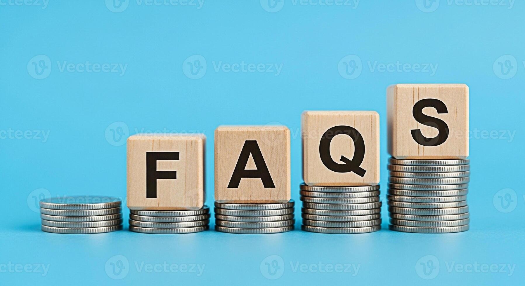 de madera bloques ortografía preguntas frecuentes son apilado en pila de algo de monedas en contra un azul antecedentes representando frecuentemente preguntó preguntas acerca de Finanzas inversión y dinero administración con un claro y informativo C Foto Pro