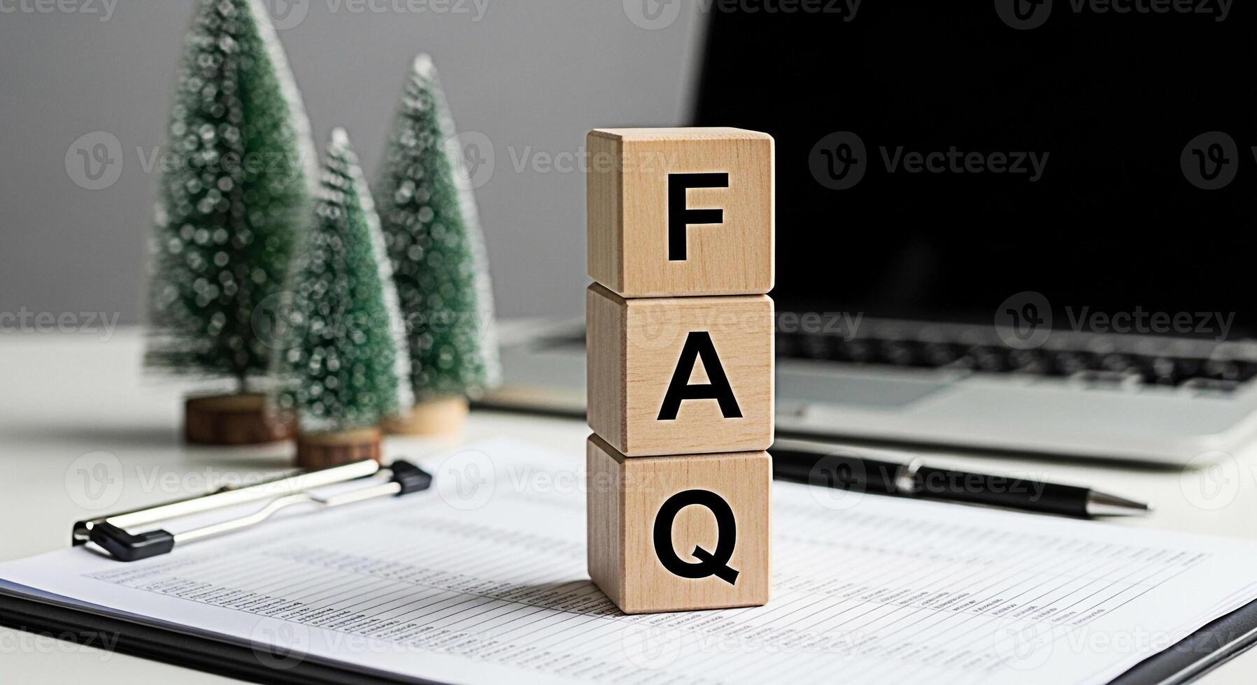 de madera bloques mostrando Preguntas más frecuentes en un moderno blanco escritorio con Navidad arboles y un ordenador portátil computadora representando frecuentemente preguntó preguntas y apoyo durante el fiesta temporada en un profesional ajuste Foto Pro