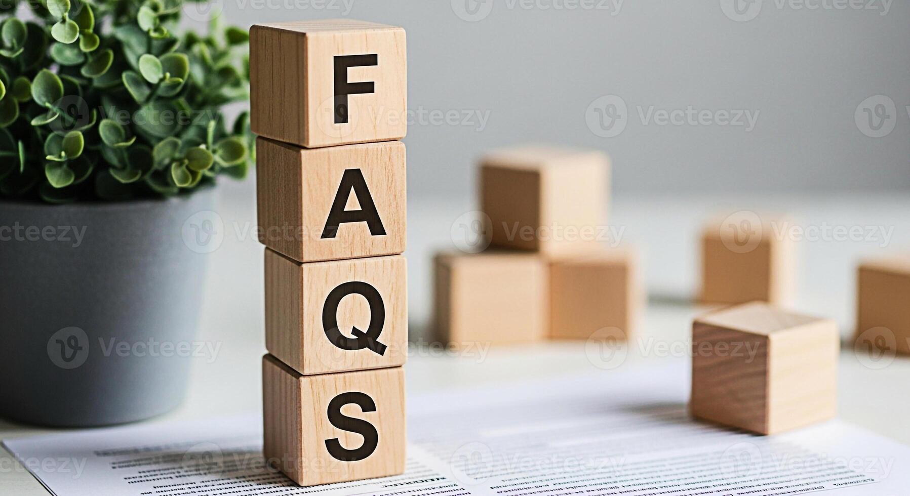 de madera bloques ortografía preguntas frecuentes apilado en un documento en un brillante oficina ajuste representando frecuentemente preguntó preguntas y un servicial informativo y accesible cliente apoyo experiencia Foto Pro