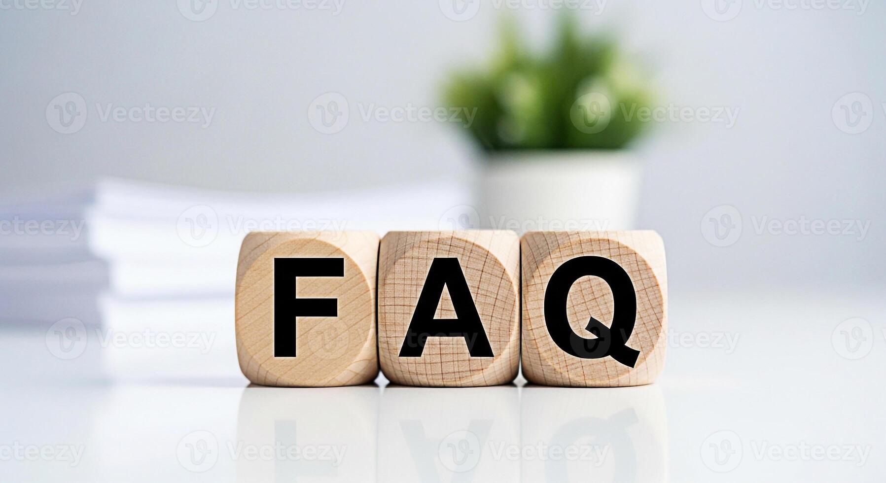 de madera bloques mostrando Preguntas más frecuentes en un blanco mesa simbolizando frecuentemente preguntó preguntas y Proporcionar información en un limpiar profesional ajuste promoviendo claridad y cliente apoyo Foto Pro