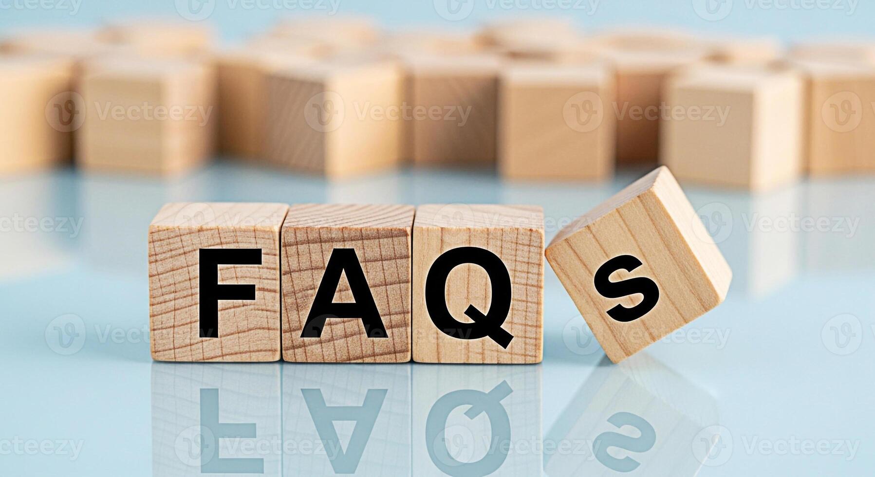 de madera bloques ortografía preguntas frecuentes en un reflexivo azul superficie representando frecuentemente preguntó preguntas y información creando un claro y servicial atmósfera para cliente apoyo y en línea asistencia Foto Pro