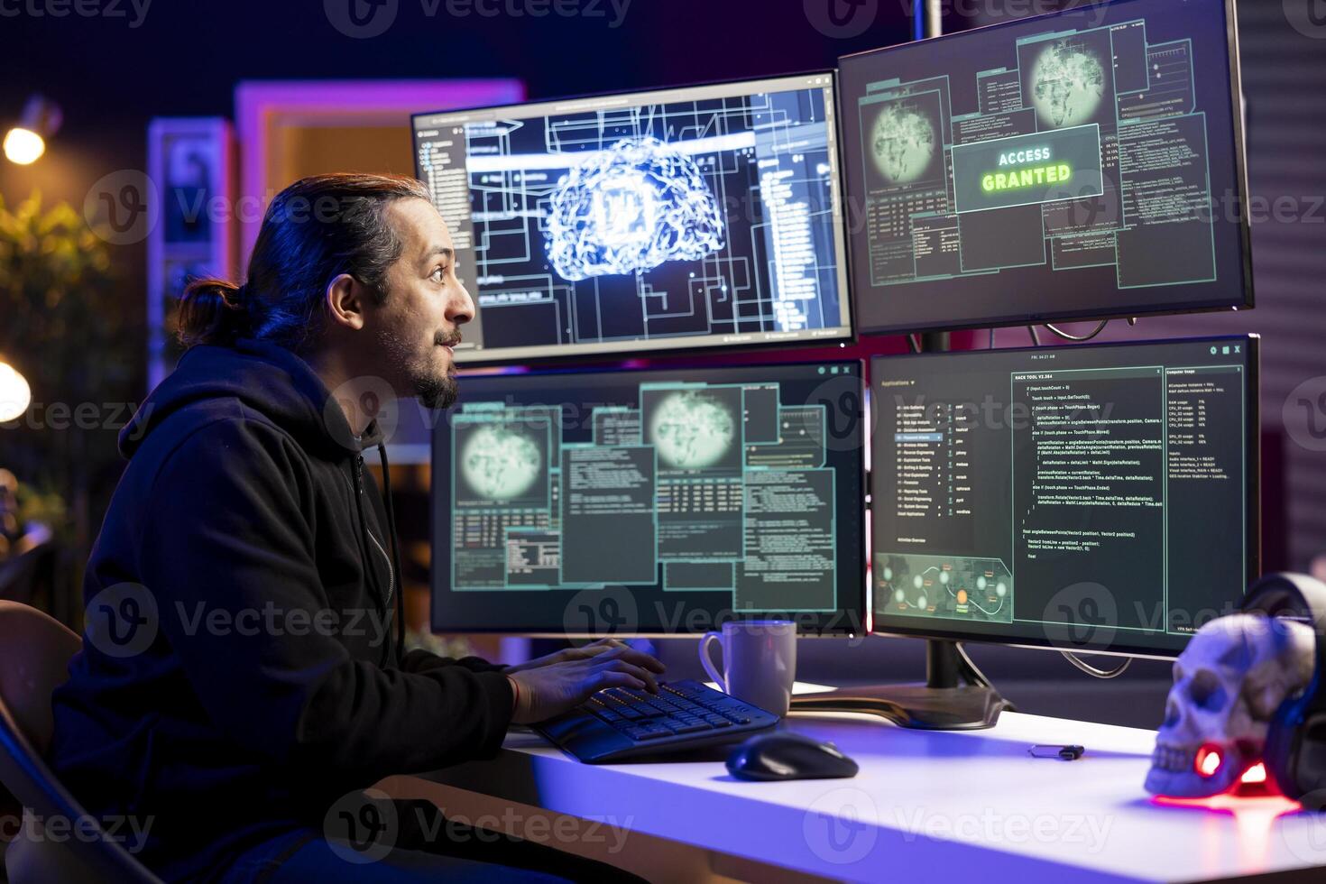 contento hacker satisfecho después consiguiendo acceso concedido mensaje, evadir seguridad con sigilo programa malicioso jubiloso hombre Encantado después exitosamente haciendo guión ocultación malicioso código desde detección sistemas Foto Pro