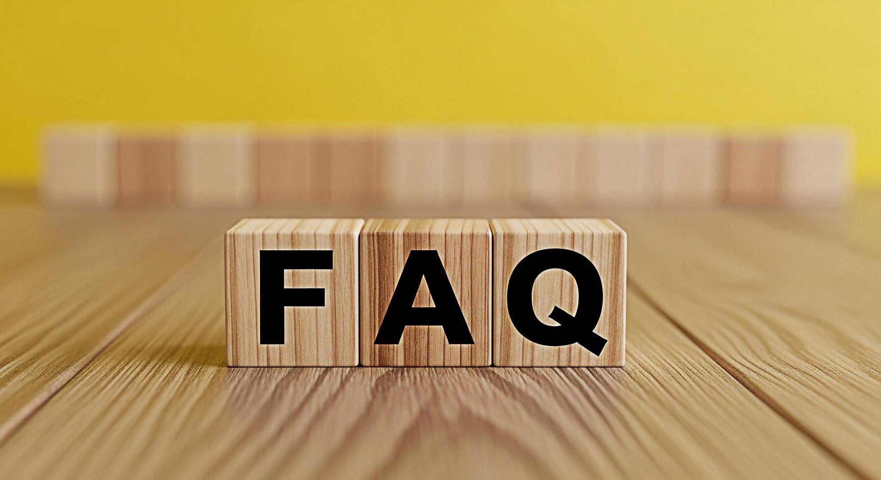 de madera bloques mostrando Preguntas más frecuentes en un de madera superficie en contra un amarillo antecedentes representando frecuentemente preguntó preguntas y Proporcionar servicial información con un claro y conciso mensaje foto