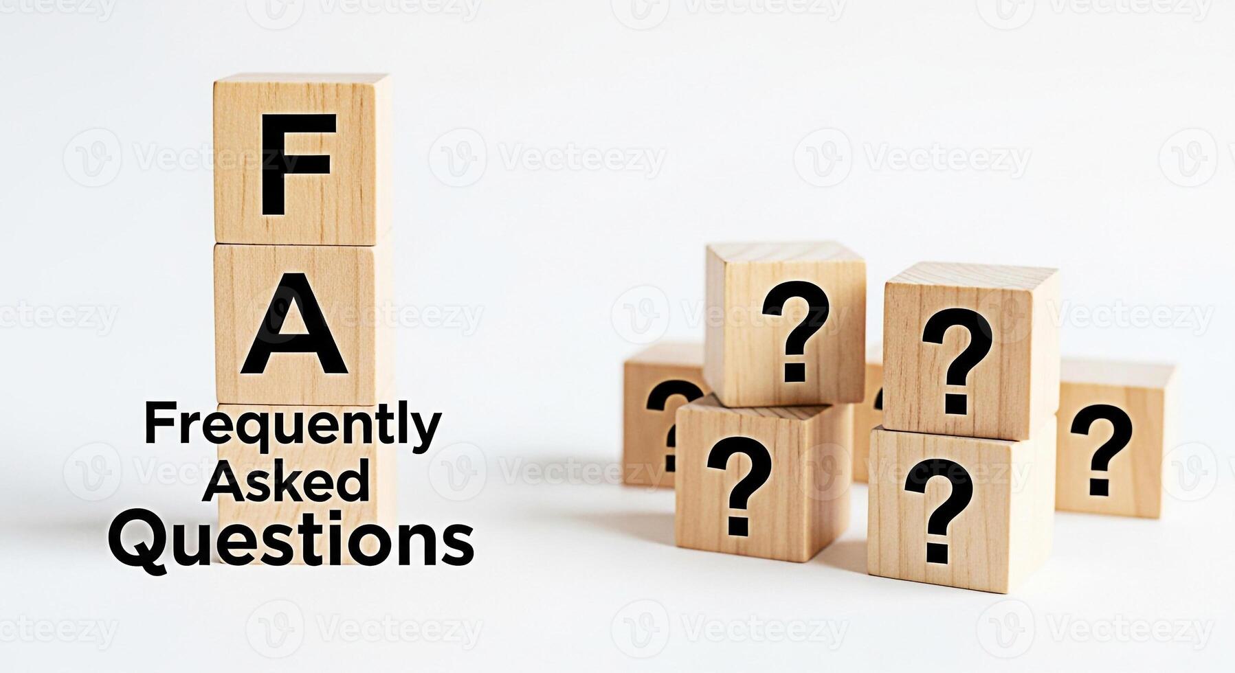 de madera bloques mostrando Preguntas más frecuentes y pregunta marcas en un limpiar blanco superficie representando frecuentemente preguntó preguntas y buscando respuestas en un sencillo minimalista ajuste transporte claridad y información Foto Pro