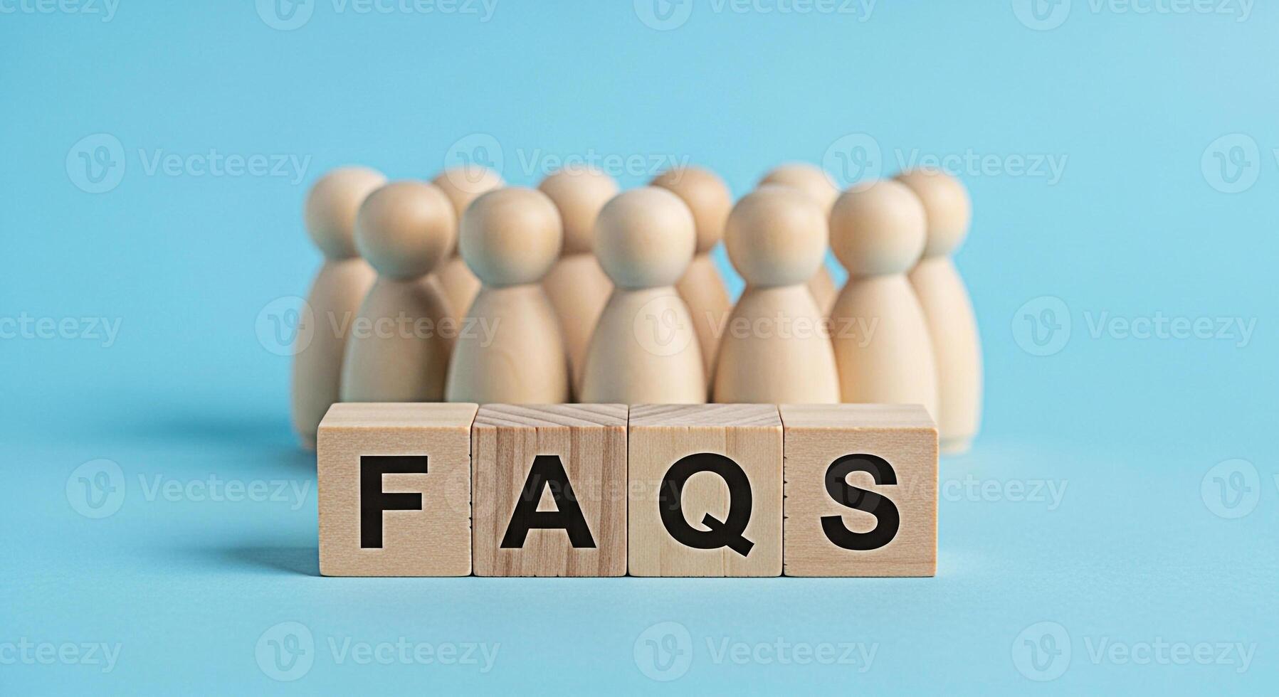 de madera cifras en pie detrás Preguntas más frecuentes bloques en un azul antecedentes representando frecuentemente preguntó preguntas y buscando respuestas creando un apoyo y informativo atmósfera para clientes y los usuarios Foto Pro