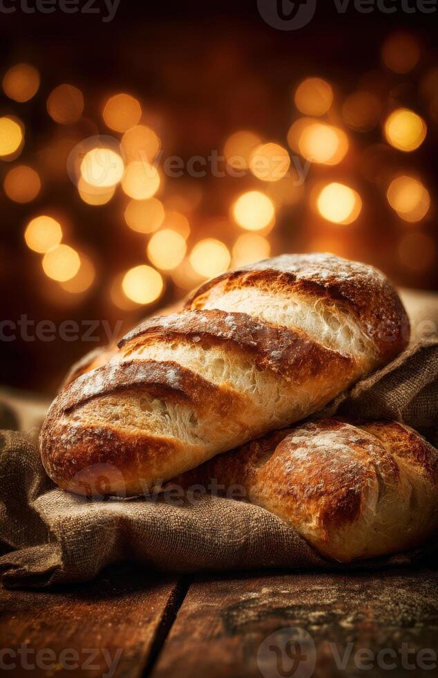 artesano baguettes en rústico mesa con calentar bokeh Foto Pro