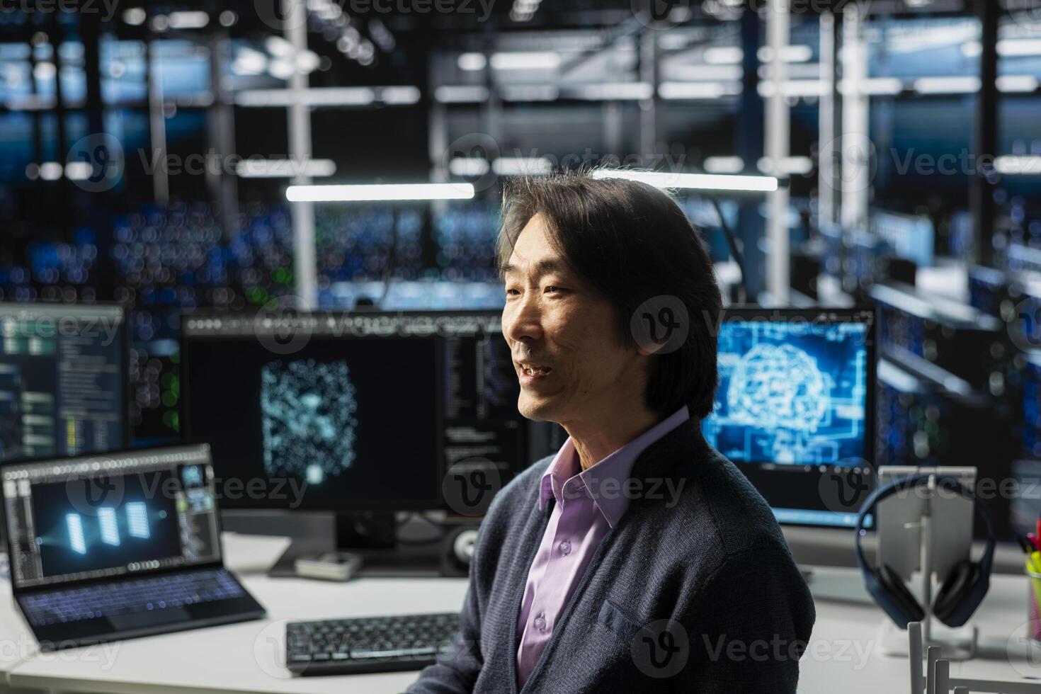 sistema administrador en datos centrar utilizando ordenador personal, gerente ai formación conjuntos de datos. asiático hombre utilizando computadora programa a supervisar máquina aprendizaje en servidor habitación secundario escalable infraestructura para ai aplicaciones Foto Pro