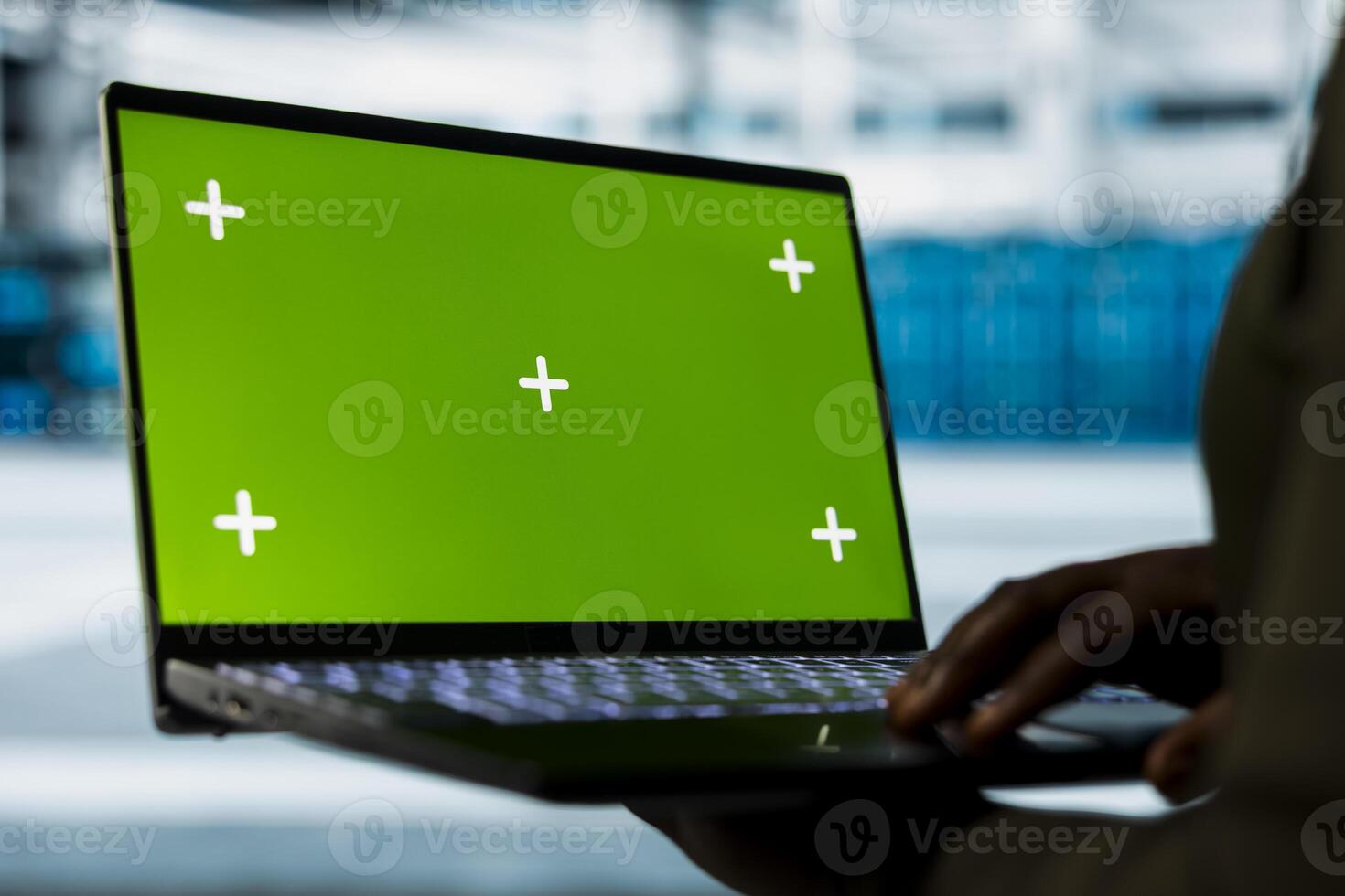 cerca arriba de datos centrar desarrollador utilizando aislado pantalla ordenador portátil a solucionar problemas backend operaciones. servidor cubo gerente corriendo software desarrollo herramientas en Bosquejo computadora portátil, resolviendo sistema choques Foto Pro