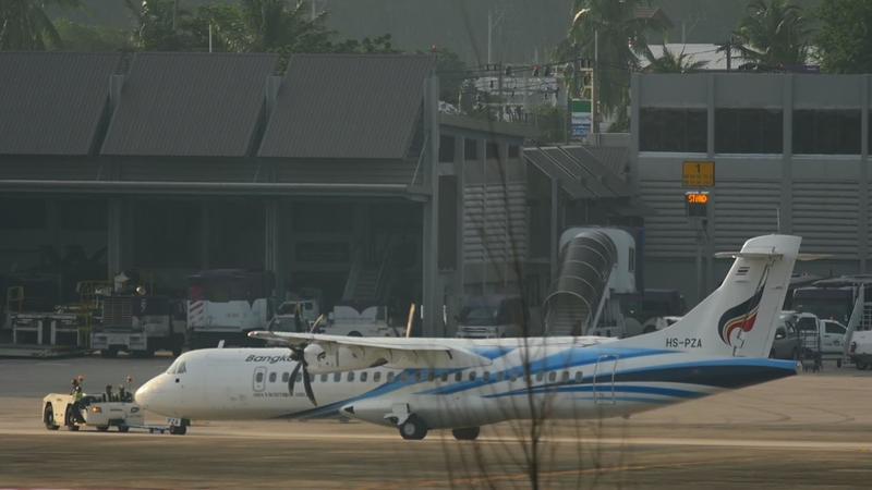 phuket, tailandia 4 de diciembre de 2016 - bangkok airways atr 72 hs pza remolque antes de la salida, temprano en la mañana. vista desde el último piso del hotel centara grand west sands resort phuket