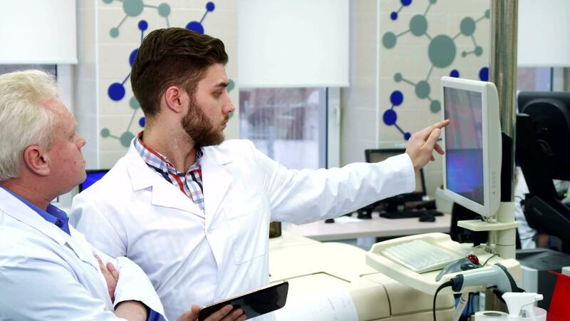 hombre compara datos en computadora y tableta a el laboratorio Vídeo Gratis