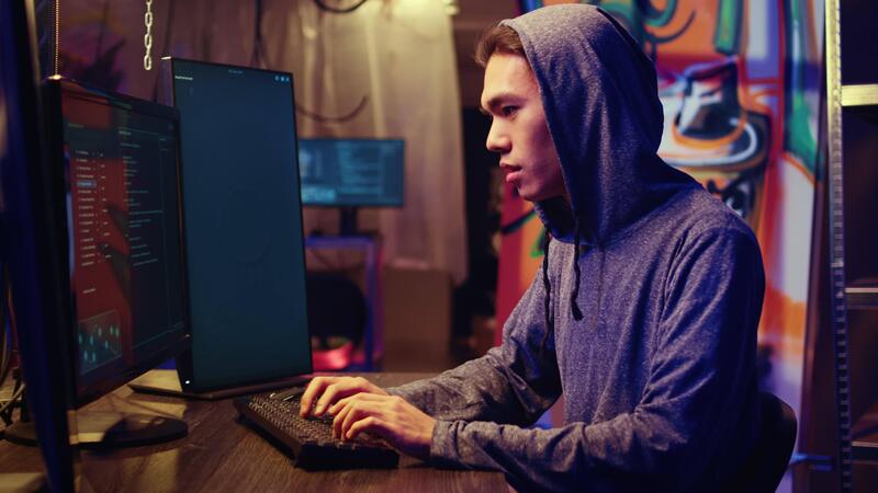 hacker emocionado después finalmente desarrollando cero día explotar indetectable por antivirus software instalado en sistemas pícaro programador contento a exitosamente truco cortafuegos, cerca arriba Vídeo Pro