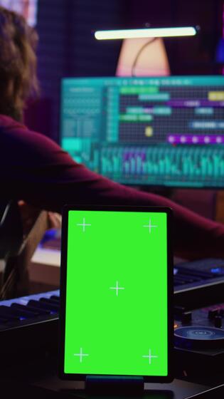 vertical vídeo compositor ejecutando acústico guitarra en su hogar estudio, jugando y practicando en instrumentos de cuerda. músico aprendizaje múltiple canciones en instrumento, usos tableta a correr pantalla verde mostrar. cámara b. Vídeo Pro