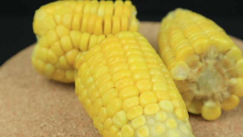 un mazorca de maíz en un giratorio monitor caso en de cerca, negro antecedentes Vídeo Gratis