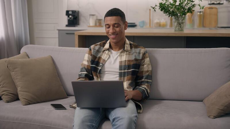 contento sonriente africano americano étnico hombre trabajando a hogar distante en línea trabajo estudiando a sofá chico ordenador portátil utilizando computadora a sofá masculino utilizando ordenador personal jugando Internet juego utilizar aplicación compras chateando Vídeo Pro