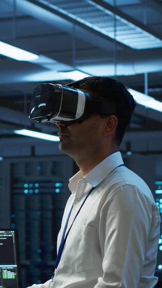 vertical ingeniero vistiendo vr auriculares en datos centrar instalando software en computadora, solución de problemas asuntos. eso experto en servidor cubo utilizando virtual realidad tecnología, estableciendo actuación puntos de referencia, cámara un Vídeo Pro