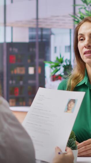 vertical durante un estructurado trabajo entrevista, solicitante regalos su CV a un negocio reclutador, elaborando en su carrera historia y aspiraciones carrera desarrollo dentro el empresa. cámara una. Vídeo Pro