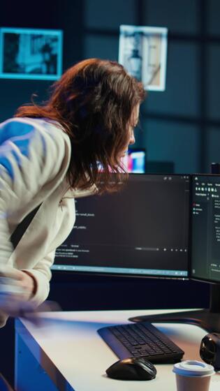 vertical computadora científico llegando en hogar oficina, Listo a diseño y desarrollar software aplicaciones eso experto comenzando trabajo cambio, implementar y mantener empresa sistemas, cámara si Vídeo Pro