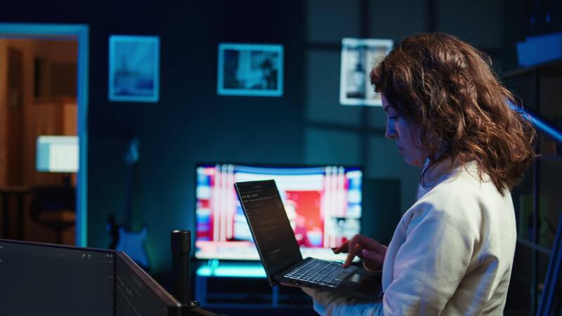 desarrollador haciendo software depuración utilizando computadora portátil, comprobación problemas técnicos en líneas de código, trastornado acerca de errores mujer caminando alrededor hogar fijación codificación cuestiones utilizando cuaderno dispositivo, cámara si Vídeo Pro