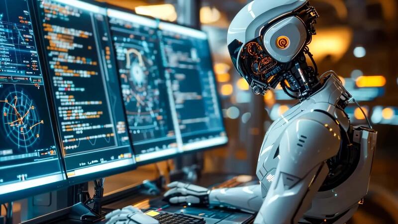 un robot sentado a un escritorio en frente de múltiple computadora monitores Vídeo Pro