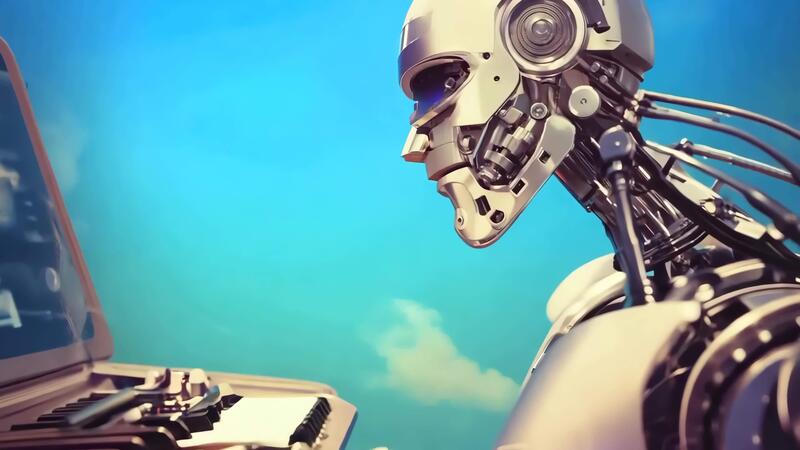 un robot jugando un teclado en frente de un ordenador portátil computadora Vídeo Pro