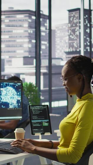 vertical software ingeniero conduce código revisión a reparar insectos, identificando técnico cuestiones con artificial inteligencia empresa software. africano americano mujer depuración y optimizando código utilizando ai, cámara si Vídeo Pro