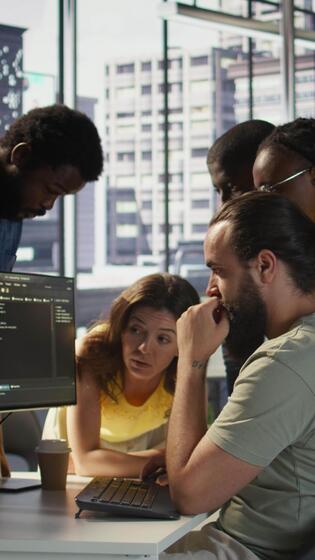 vertical programadores reunido juntos a conducta código revisión a reparar errores, identificando técnico cuestiones con empresa software. equipo de desarrolladores haciendo lluvia de ideas, optimizando código, cámara si Vídeo Pro