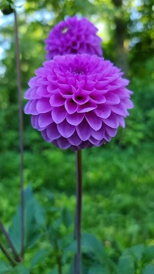de cerca de un púrpura dalia en lleno floración, sus delicado en capas pétalos formando un Perfecto esfera. un segundo dalia floraciones ligeramente fuera de atención en el fondo, agregando profundidad a el composición. Vídeo Gratis