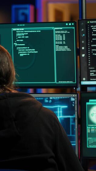 vertical hacker Bebiendo café mientras corriendo artificial inteligencia spyware software diseñado a reunir información desde usuarios guión niño haciendo ilegal cosas utilizando ai, consumidor bebida, cámara un Vídeo Pro
