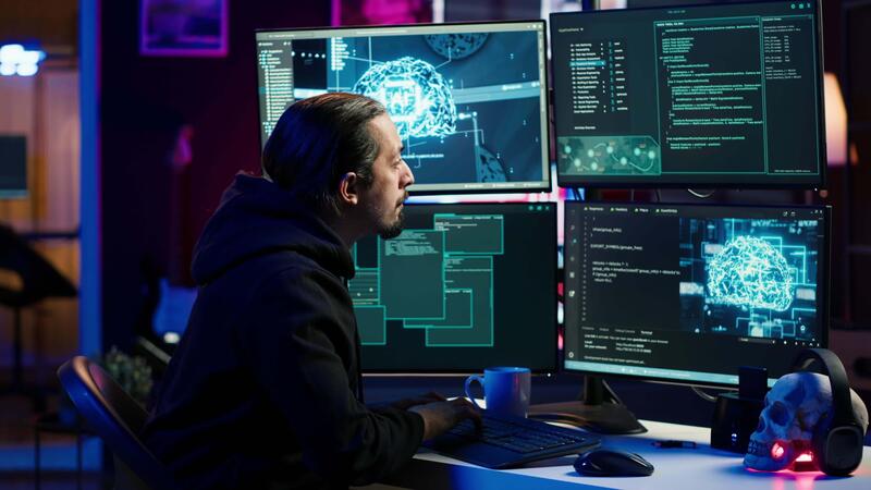 hacker utilizando ai tecnología a objetivo vulnerable sin parchear conexiones a robar datos. ciberdelincuente utilizando artificial inteligencia a compromiso digital dispositivos y ganancia ilícito información, cámara un Vídeo Pro