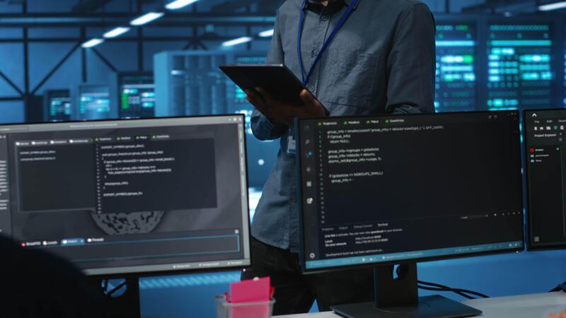 técnico en servidor cubo utilizando tableta a encontrar hardware configuraciones erróneas conmovedor montajes en rack actuación. hombre comprobación datos centrar infraestructura dispositivos cuellos de botella líder a errores Vídeo Pro
