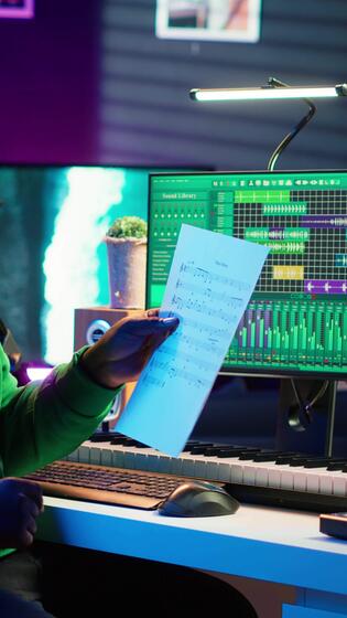 vertical artista señalando a musical sábana notación a explique notas en piano, enseñando personas a jugar sintetizador en hogar estudio. compositor músico jugando midi controlador durante en línea Maestro clase. cámara una. Vídeo Pro