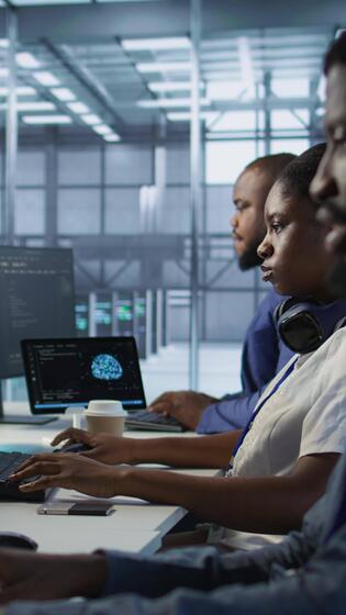 vertical administración en datos centrar Bebiendo café y implementar ai profético mantenimiento sistemas servidor cubo trabajador disfrutando caliente bebida, utilizando artificial inteligencia a identificar hardware fracasos, cámara un Vídeo Pro