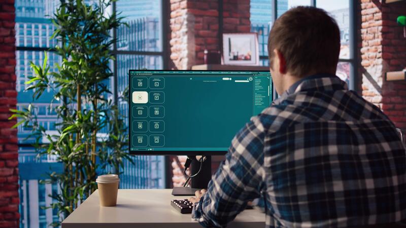 hombre en hogar oficina utilizando generativo artificial inteligencia sitio web generando videos utilizando difusión modelos persona vistiendo auriculares utilizando ai virtual asistente productor clips para a él, cámara un Vídeo Pro
