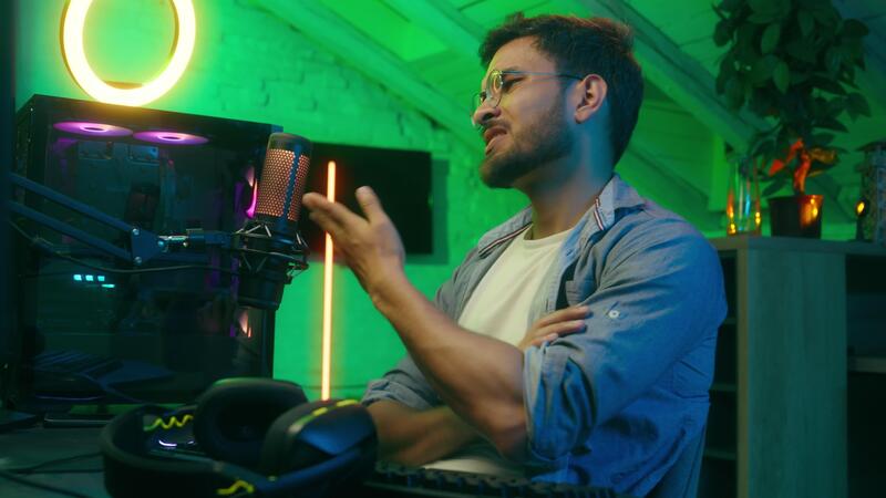 enojado fracaso enojado agresivo llamada programador cripto hacker hablando argumento perdido juego caucásico hombre flámula masculino chico empresario negocio computadora corriente hablando micrófono a hogar oscuro neón Vídeo Pro