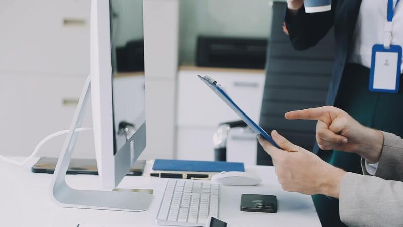 un hombre es utilizando un tableta computadora mientras sentado a un escritorio Vídeo Gratis
