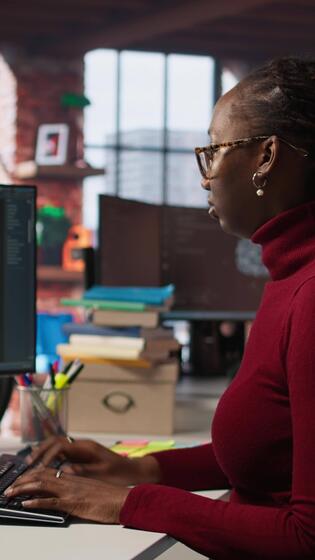 vertical eso técnico en puesta en marcha oficina utilizando grande idioma modelo a obtener ayuda con codificación proyecto. eso especialista interactuando con ai llm chatbot en ordenador personal en software desarrollo negocio compañía, cámara un Vídeo Pro