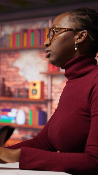 vertical eso empleado utilizando programación idiomas en ordenador personal en ai puesta en marcha oficina a construir aplicaciones, disfrutando bocadillo. mujer utilizando computadora en artificial inteligencia desarrollo agencia, comiendo alimento, cámara si Vídeo Pro