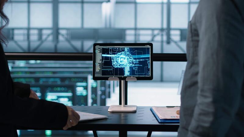 equipo de eso profesionales mirando terminado datos centrar chequeo papeleo, utilizando ai tecnología en tableta. colegas colaborando en servidor granja, leyendo documentación, utilizando artificial inteligencia, cámara un Vídeo Pro