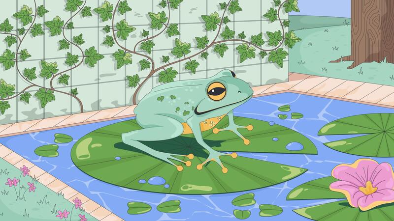 pacífico rana en lirio almohadilla en estanque en contra hiedra pared lofi animación dibujos animados fondo de pantalla. loto agua plantas sapo. anfibio en nenúfar. lo fi 2d animado antecedentes 4k . concepto frío estético Vídeo Pro