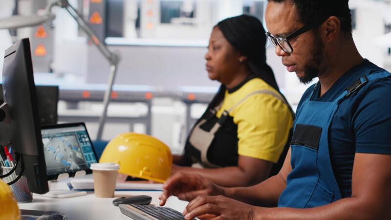 empleado usos computadora a controlar robótico brazos en solar fábrica en un alto tecnología sostenible instalación. técnico ajusta automatización ajustes a apoyo consistente fabricación. cámara una. Vídeo Pro